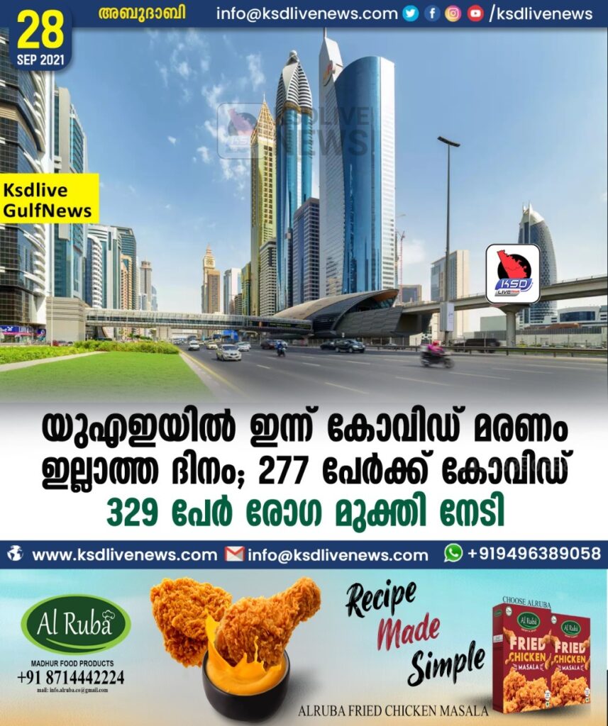 യുഎഇയില് ഇന്ന് കോവിഡ് മരണം ഇല്ലാത്ത ദിനം; 277 പേർക്ക് കോവിഡ് സ്ഥിരീകരിച്ചു; 329 പേർ രോഗ മുക്തി നേടി