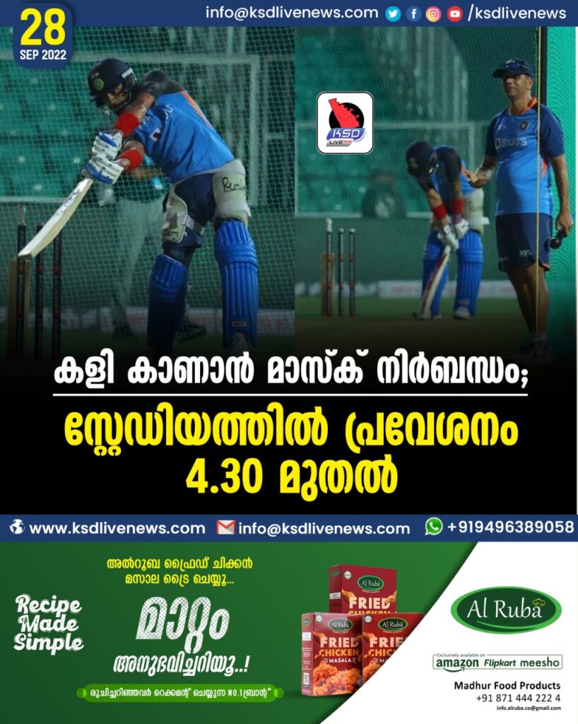 തിരുവനന്തപുരം: കാര്യവട്ടം ഗ്രീന്‍ഫീല്‍ഡ് സ്റ്റേഡിയത്തില്‍ ഇന്ന് നടക്കുന്ന ഇന്ത്യ – ദക്ഷിണാഫ്രിക്ക ട്വന്റി 20 മത്സരം കാണാന്‍ മാസ്‌ക് നിര്‍ബന്ധം. 38000 പേര്‍ക്ക് കളികാണാന്‍ അവസരമുണ്ട്. ടിക്കറ്റുകളെല്ലാം വിറ്റുപോയതായി കെ.സി.എ. അധികൃതര്‍ അറിയിച്ചു. വൈകീട്ട് 4.30 മുതല്‍ സ്റ്റേഡിയത്തില്‍ പ്രവേശിക്കാം. സ്റ്റേഡിയത്തില്‍ കയറാന്‍ ടിക്കറ്റിനൊപ്പം തിരിച്ചറിയല്‍ കാര്‍ഡും കാണിക്കണം.