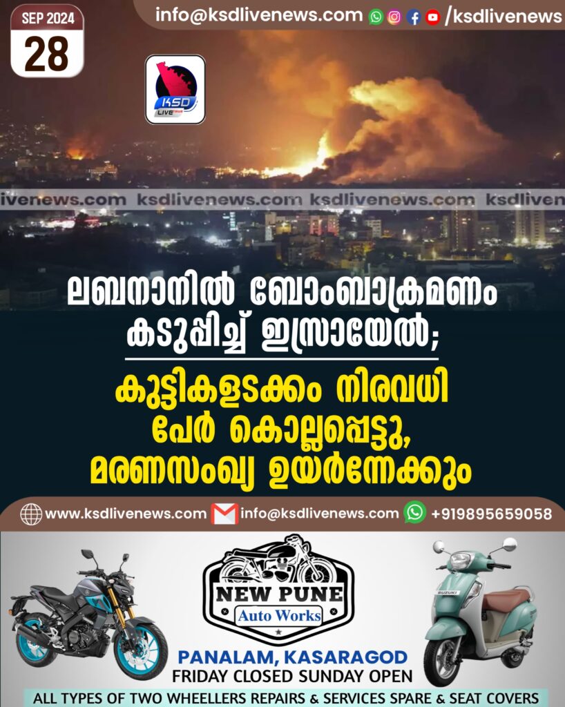 മരണസംഖ്യകുത്തനെ വർദ്ധിക്കുമെന്നാണ് അന്താരാഷ്ട്ര മാധ്യമങ്ങൾ റിപ്പോർട്ട് ചെയ്യുന്നത്. തിങ്കളാഴ്ച മുതൽ ലബനാനിൽ ഇസ്രായേൽ നടത്തിയ ആക്രമണത്തിൽ 700-ലധികം പേർ കൊല്ലപ്പെട്ടതായാണ് റിപ്പോർട്ട്. ഹിസ്ബുല്ലയുടെ കമാൻഡ് സെന്റർ, ആയുധ ഡിപ്പോകൾ എന്നിവ ലക്ഷ്യമിട്ടാണ് ബോംബാക്രമണം നടത്തിയതെന്ന് ഇസ്രായേൽ അവകാശപ്പെട്ടെങ്കിലും ജനവാസമേഖലയിലാണ് ആക്രമണം നടത്തിയതെന്ന് അന്താരാഷ്ട്ര മാധ്യമങ്ങൾ റിപ്പോർട്ട് ചെയ്യുന്നു. ദാഹിയയിൽ നിന്ന് ആയിരങ്ങളാണ് പലായനം ചെയ്യുന്നത്.