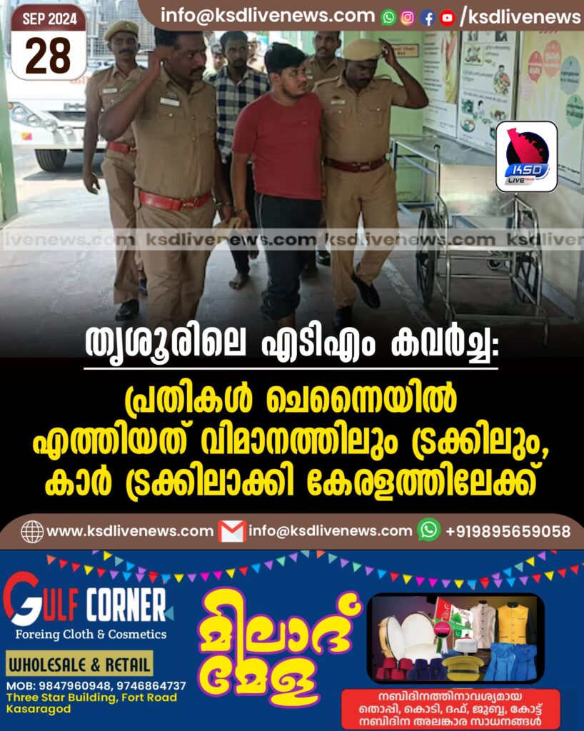 തൃശൂരിലെ എടിഎം കവർച്ച: പ്രതികൾ ചെന്നൈയിൽ എത്തിയത് വിമാനത്തിലും ട്രക്കിലും, കാർ ട്രക്കിലാക്കി കേരളത്തിലേക്ക്