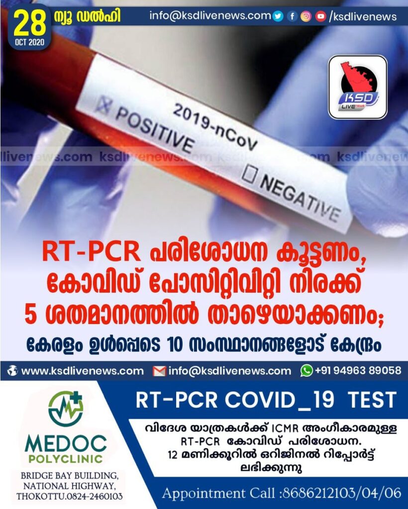 RT-PCR പരിശോധന കൂട്ടണം , കോവിഡ് പോസിറ്റിവിറ്റി നിരക്ക് 5 ശതമാനത്തിൽ താഴെയാക്കണം ; കേരളം ഉൾപ്പെടെ 10 സംസ്ഥാനങ്ങളോട് കേന്ദ്രം