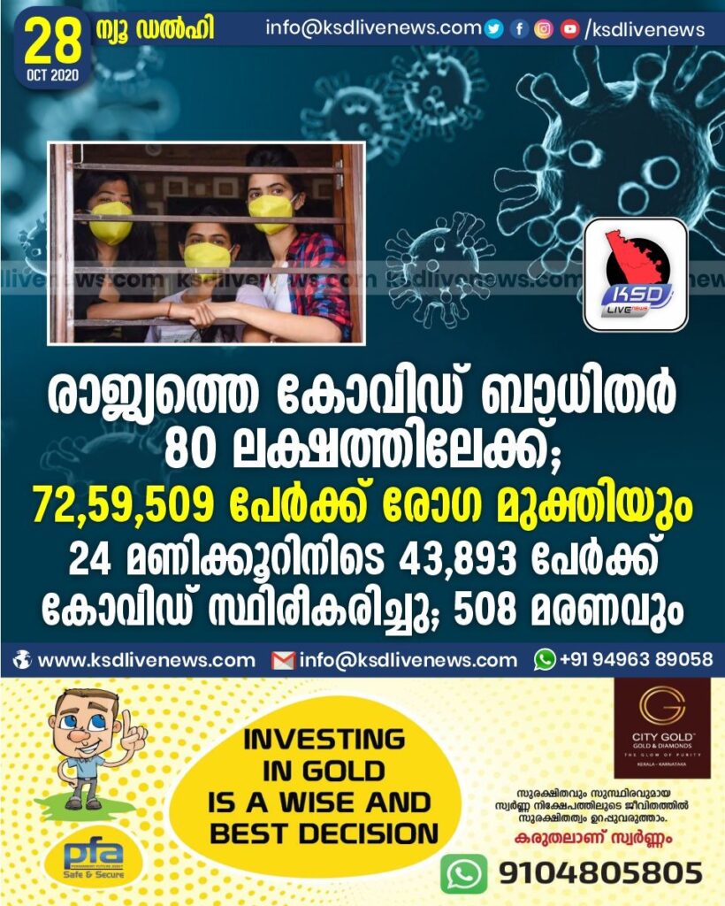 രാജ്യത്തെ കോവിഡ് ബാധിതർ 80 ലക്ഷത്തിലേക്ക് ;72,59,509 പേർക്ക് രോഗ മുക്തിയും ;