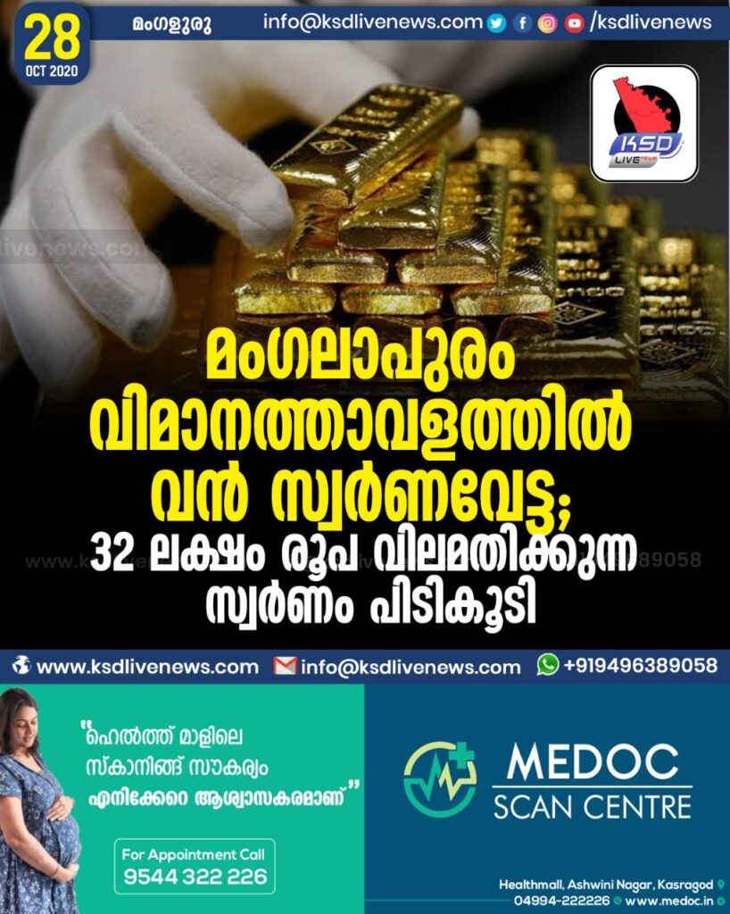 മംഗലാപുരം വിമാനത്താവളത്തില് വന് സ്വര്ണവേട്ട; 32 ലക്ഷം രൂപ വിലമതിക്കുന്ന സ്വര്ണം പിടികൂടി