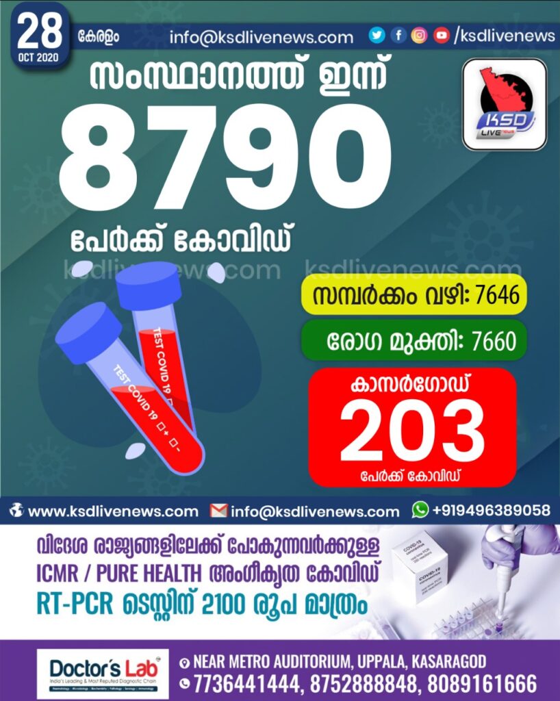 പിടിവിടാതെ കോവിഡ് : സംസ്ഥാനത്ത് ഇന്ന് 8790 പേർക്ക് കോവിഡ് സ്ഥിരീകരിച്ചു. സമ്പർക്കം വഴി 7646 പേർക്കും.രോഗ മുക്തി 7660 പേർക്കും. കാസർഗോഡ് ജില്ലയിൽ ഇന്ന് 203 പേർക്ക് കോവിഡ് സ്ഥിരീകരിച്ചു. മരണം 27