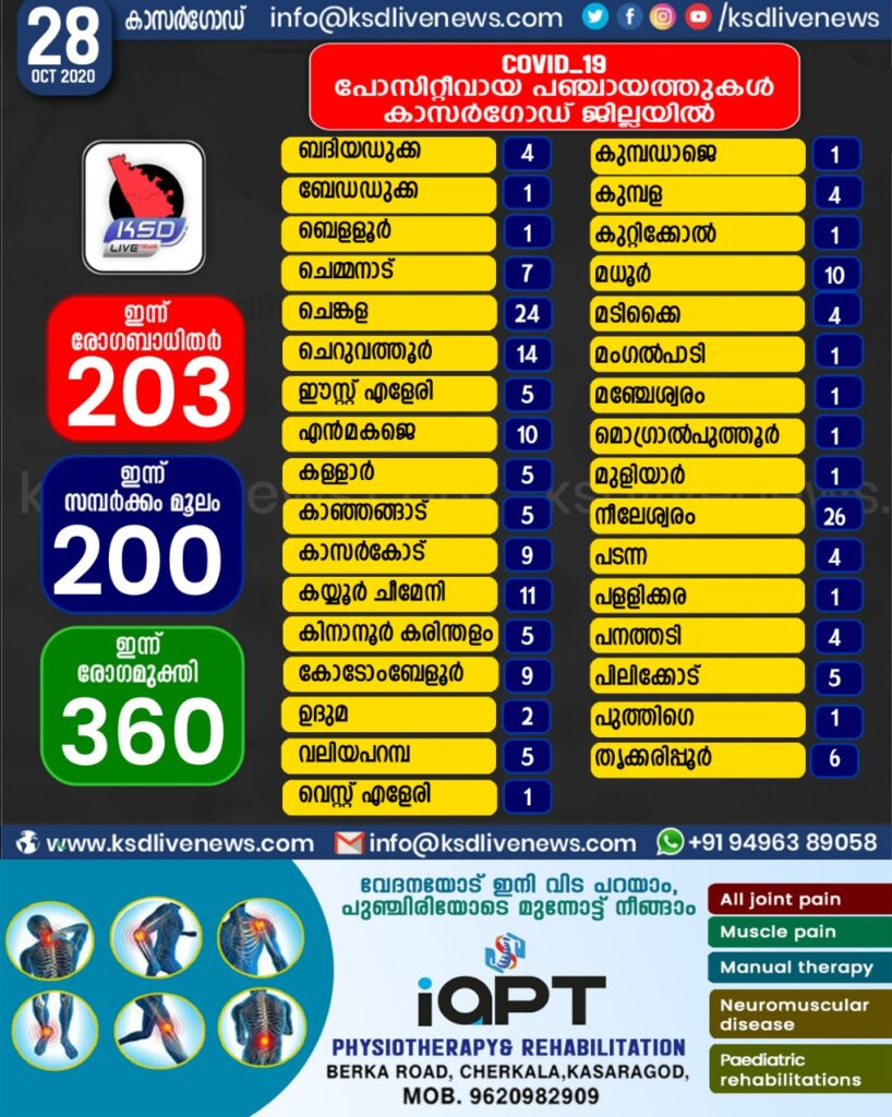 കാസർഗോഡ് ജില്ലയിൽ ഇന്ന് കോവിഡ് പോസിറ്റീവായവരുടെ പഞ്ചായത്ത് തിരിച്ചുള്ള സ്ഥിതി വിവര കണക്ക്