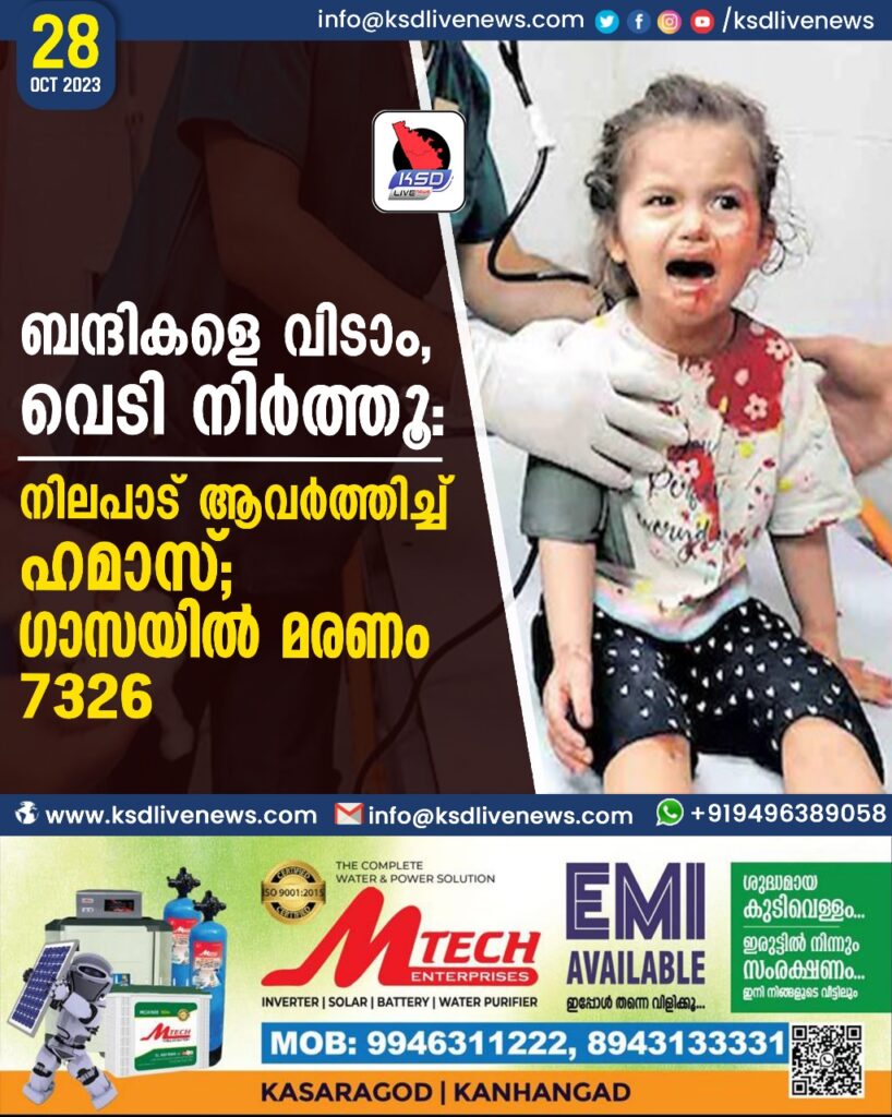 ബന്ദികളെ വിടാം, വെടി നിർത്തൂ: നിലപാട് ആവർത്തിച്ച് ഹമാസ്; ഗാസയിൽ മരണം 7326