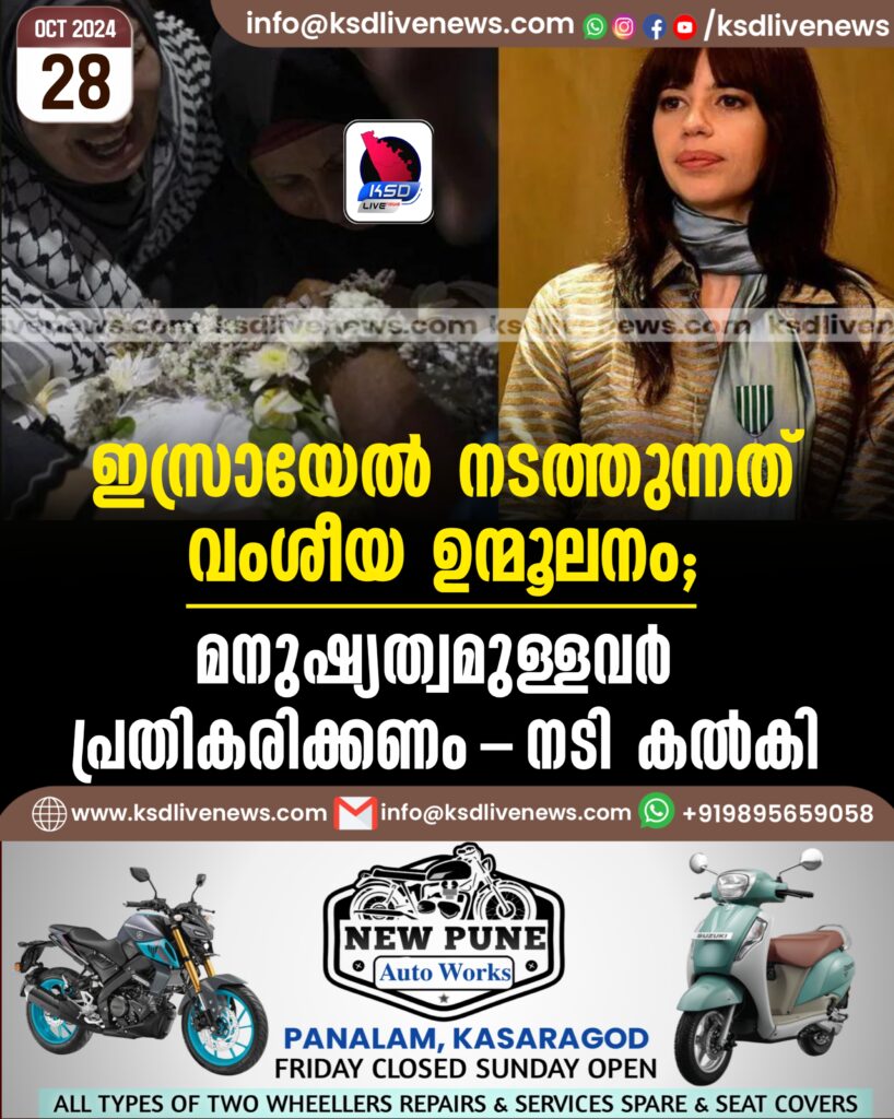 “വടക്കന് ഗാസയെ ശൂന്യമാക്കാനുള്ള ഇസ്രായേലിന്റെ ശ്രമങ്ങള് വംശീയ ഉന്മൂലനമാണ്. ഇസ്രയേലിന്റെയും പലസ്തീന്റെയും ഭാവി തലമുറകള്ക്ക് മരണമല്ലാതെ മറ്റൊന്നും ഈ സര്ക്കാര് വാഗ്ദാനം ചെയ്യുന്നില്ല. ഇക്കാര്യങ്ങളെ കുറിച്ച് പ്രതികരിക്കാന് തയ്യാറാവൂ… സാമൂഹിക മാധ്യമങ്ങളില് വരുന്ന വിവരങ്ങള്ക്കപ്പുറത്ത് നിങ്ങളുടേതായ അന്വേഷണങ്ങള് നടത്തു”. ഈ ഭീകരത അവസാനിപ്പക്കാനായി ഈ പ്രദേശത്ത് പ്രവര്ത്തിക്കുന്നവരെ പിന്തുണയ്ക്കാന് തയ്യാറാവണമെന്നും കല്കി കുറിച്ചു.