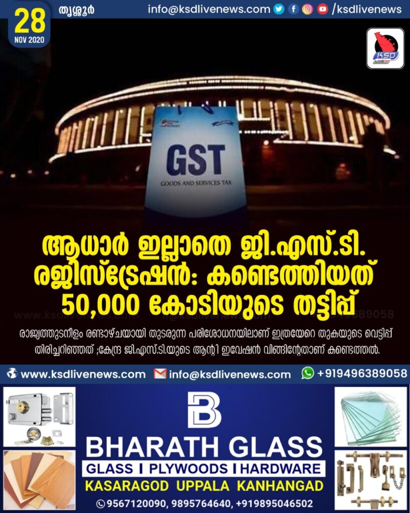 ആധാർ ഇല്ലാതെ ജി.എസ്.ടി. രജിസ്ട്രേഷൻ : കണ്ടെത്തിയത് 50,000 കോടിയുടെ തട്ടിപ്പ്