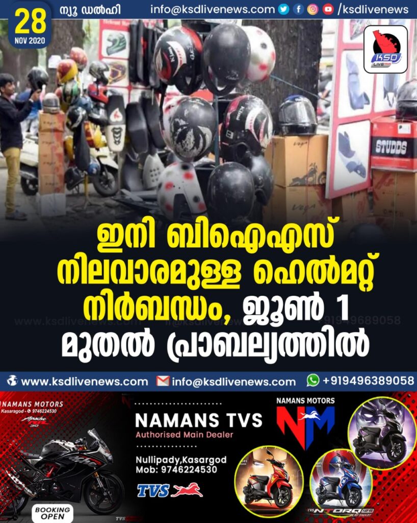 ഇനി ബിഐഎസ് നിലവാരമുള്ള ഹെൽമറ്റ് നിർബന്ധം , ജൂൺ 1 മുതൽ പ്രാബല്യത്തിൽ