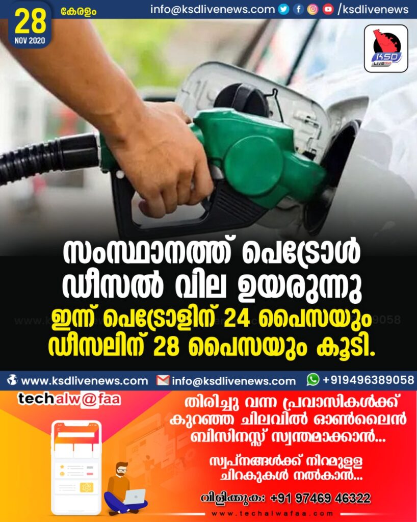 ഇന്ന് പെട്രോളിന് 24 പൈസയും ഡീസലിന് 28 പൈസയും കൂടി.