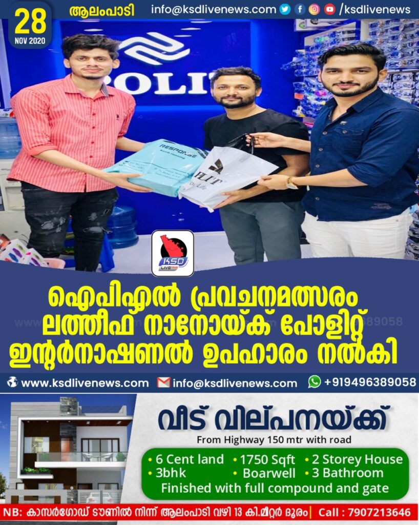 ആലംപാടി; ആലംപാടി കൂട്ടായ്മ നടത്തിയ ഐപിഎൽ പ്രവചനമത്സരത്തിൽ ഒന്നാംസ്ഥാനം നേടിയ ലത്തീഫ് നനോ എരുതുംകടവിന്ന് പോളിറ്റ് ഇന്റർനാഷണൽസ്പോണ്സർ ചെയ്ത ഉപഹാരം നൽകി.