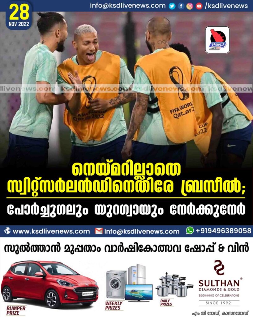 ദോഹ: സൂപ്പര്താരം നെയ്മറിന്റെ അഭാവത്തില് ബ്രസീല് ലോകകപ്പ് ഫുട്ബോളിലെ നിര്ണായക പോരാട്ടത്തിനിറങ്ങുന്നു. തിങ്കളാഴ്ച രാത്രി 9.30-ന് സ്വിറ്റ്സര്ലന്ഡാണ് എതിരാളി. ജയിക്കുന്ന ടീമിന് നോക്കൗട്ട് സാധ്യത വര്ധിക്കും. ഗ്രൂപ്പ് ജിയിലെ മറ്റൊരു കളിയില് കാമറൂണ് സെര്ബിയയുമായി കളിക്കും. വൈകീട്ട് 3.30-നാണ് മത്സരം. ആദ്യകളിയില് പ്രതിരോധ ഫുട്ബോള് കളിച്ച സെര്ബിയയെ തോല്പ്പിച്ചതിന്റെ ആത്മവിശ്വാസത്തിലാണ് ബ്രസീല്. സ്ട്രൈക്കര് റിച്ചാലിസന് ഇരട്ടഗോള്നേടിയത് പരിശീലകന് ടിറ്റെയ്ക്ക് ആത്മവിശ്വാസം പകരുന്നു. നെയ്മറിനുപകരം ആരെയാകും കളിപ്പിക്കുകയെന്ന കാര്യം വ്യക്തമായിട്ടില്ല. നെയ്മറുടെ പൊസിഷനില് റോഡ്രിഗോയോ ലൂക്കാസ് പാക്വിറ്റോയോ വരാനാണ് സാധ്യത. Next Stay പരിക്കേറ്റ പ്രതിരോധനിരതാരം ഡാനിലോയ്ക്ക് പകരം ഡാനി അല്വ്സോ എഡര് മിലിറ്റാവോയോ ഇറങ്ങും. ആദ്യകളിയില് സ്വിറ്റ്സര്ലന്ഡ് കാമറൂണിനെ തോല്പ്പിച്ചിരുന്നു. ഗ്രാനിറ്റ് ഷാക്ക, ഷെര്ഡാന് ഷാക്കീരി എന്നിവര് കളിക്കുന്ന മധ്യനിര ശക്തമാണ്. രണ്ട് ടീമിനും ജയിച്ചാല് പ്രീക്വാര്ട്ടര് സാധ്യത സജീവമാകും. രാത്രി 12.30-ന് ഗ്രൂപ്പ് എച്ചില് പോര്ച്ചുഗല് യുറഗ്വായെ നേരിടും. 6.30-ന് ദക്ഷിണ കൊറിയ ഘാനയുമായി ഏറ്റുമുട്ടും.” https://www.mathrubhumi.com/special-pages/fifa-world-cup-2022/news/qatar-world-cup-2022-day-9-preview-brazil-vs-switzerland-neymar-1.8086514#:~:text=HOME,%E0%B4%95%E0%B5%8A%E0%B4%B1%E0%B4%BF%E0%B4%AF%20%E0%B4%98%E0%B4%BE%E0%B4%A8%E0%B4%AF%E0%B5%81%E0%B4%AE%E0%B4%BE%E0%B4%AF%E0%B4%BF%20%E0%B4%8F%E0%B4%B1%E0%B5%8D%E0%B4%B1%E0%B5%81%E0%B4%AE%E0%B5%81%E0%B4%9F%E0%B5%8D%E0%B4%9F%E0%B5%81%E0%B4%82.