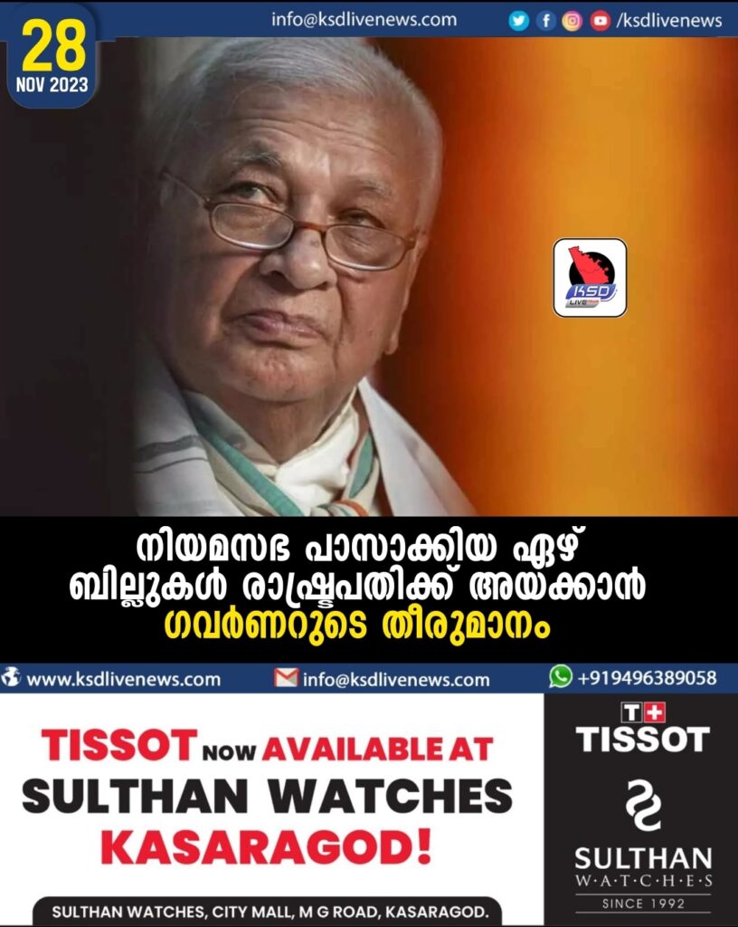 നിയമസഭ പാസാക്കിയ ഏഴ് ബില്ലുകള് രാഷ്ട്രപതിക്ക് അയക്കാന് ഗവര്ണറുടെ തീരുമാനം