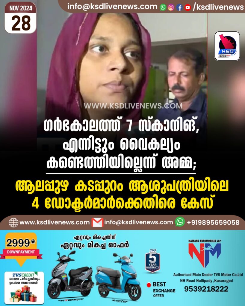 ഗര്ഭകാലത്ത് 7 സ്കാനിങ്, എന്നിട്ടും വൈകല്യം കണ്ടെത്തിയില്ലെന്ന് അമ്മ; ആലപ്പുഴ കടപ്പുറം ആശുപത്രിയിലെ 4 ഡോക്ടര്മാര്ക്കെതിരെ കേസ്