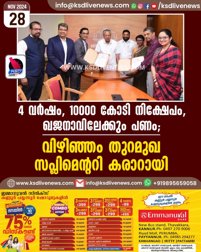 4 വര്ഷം, 10000 കോടി നിക്ഷേപം, ഖജനാവിലേക്കും പണം; വിഴിഞ്ഞം തുറമുഖ സപ്ലിമെന്ററി കരാറായി