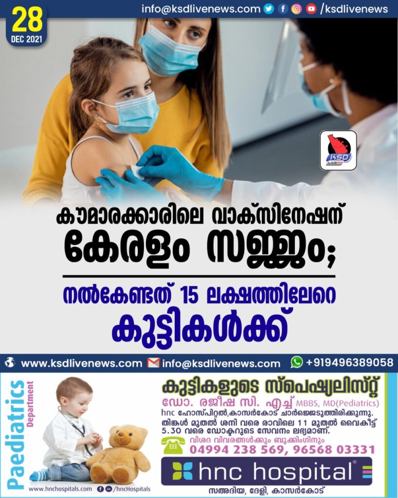 കൗമാരക്കാരിലെ വാക്സിനേഷന് കേരളം സജ്ജം; നൽകേണ്ടത് 15ലക്ഷത്തിലേറെ കുട്ടികൾക്ക്