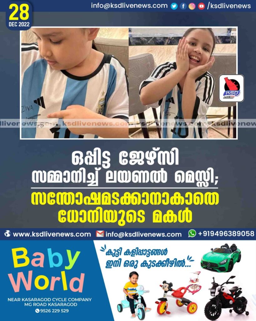 ഇപ്പോള്‍ അച്ഛന്റേ അതേ വഴിയാണ് മകള്‍ സിവ ധോനിയുടേയും യാത്ര. അര്‍ജന്റീനയുടെ കടുത്ത ആരാധികയാണ് ഈ ഏഴു വയസ്സുകാരി. ലോകകപ്പില്‍ അര്‍ജന്റീന വിജയിച്ചതിന് പിന്നാലെ സിവയെ തേടി ഒരു സര്‍പ്രൈസ് സമ്മാനമെത്തിയിരിക്കുകയാണ്. സാക്ഷാല്‍ ലയണല്‍ മെസ്സി ഒപ്പിട്ട അര്‍ജന്റീനയുടെ ജേഴ്‌സി.
