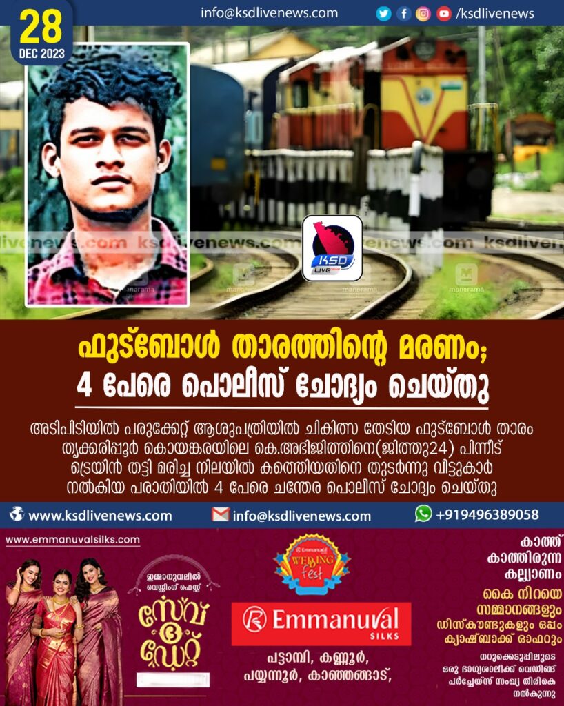 തൃക്കരിപ്പൂർ: അടിപിടിയിൽ പരുക്കേറ്റ് ആശുപത്രിയിൽ ചികിത്സ തേടിയ ഫുട്ബോൾ താരം തൃക്കരിപ്പൂർ കൊയങ്കരയിലെ കെ.അഭിജിത്തിനെ(ജിത്തു–24) പിന്നീട് ട്രെയിൻ തട്ടി മരിച്ച നിലയിൽ കണ്ടെത്തിയതിനെ തുടർന്നു വീട്ടുകാർ നൽകിയ പരാതിയിൽ 4 പേരെ ചന്തേര പൊലീസ് ചോദ്യം ചെയ്തു. തിങ്കളാഴ്ച രാത്രിയാണ് അടിപിടിൽ അഭിജിത്തിനു തലയ്ക്കും മറ്റും പരുക്കേറ്റത്. തൃക്കരിപ്പൂരിലും പിന്നീടു പയ്യന്നൂരിലുമുള്ള ആശുപത്രികളിൽ ചികിത്സ തേടിയ ശേഷം രാത്രി വൈകി വീട്ടിലെത്തിയ യുവാവ് ചൊവ്വാഴ്ച പുലർച്ചെ ട്രെയിൻ തട്ടി മരിക്കാനിടയായ സംഭവത്തിൽ സംശയവും ദുരൂഹതയും പ്രകടിപ്പിച്ചു കുടുംബം പരാതി നൽകുകയുണ്ടായി. സിഐ ജി.പി.മനുരാജിന്റെ നേതൃത്വത്തിൽ സംഭവത്തിൽ അന്വേഷണം നടത്തിയതിനെ തുടർന്നാണ് 4 പേരെ പൊലീസ് സ്റ്റേഷനിൽ വിളിച്ചുവരുത്തി ചോദ്യം ചെയ്തത്. സംഭവത്തിൽ പൊലീസ് കൂടുതൽ അന്വേഷണം നടത്തും.