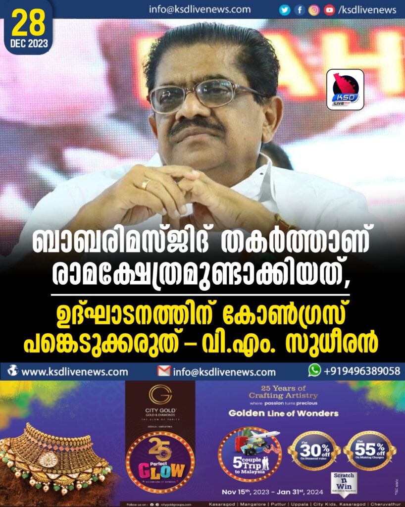 ബാബരിമസ്ജിദ് തകർത്താണ് രാമക്ഷേത്രമുണ്ടാക്കിയത്, ഉദ്ഘാടനത്തിന് കോൺഗ്രസ് പങ്കെടുക്കരുത്- വി.എം. സുധീരൻ