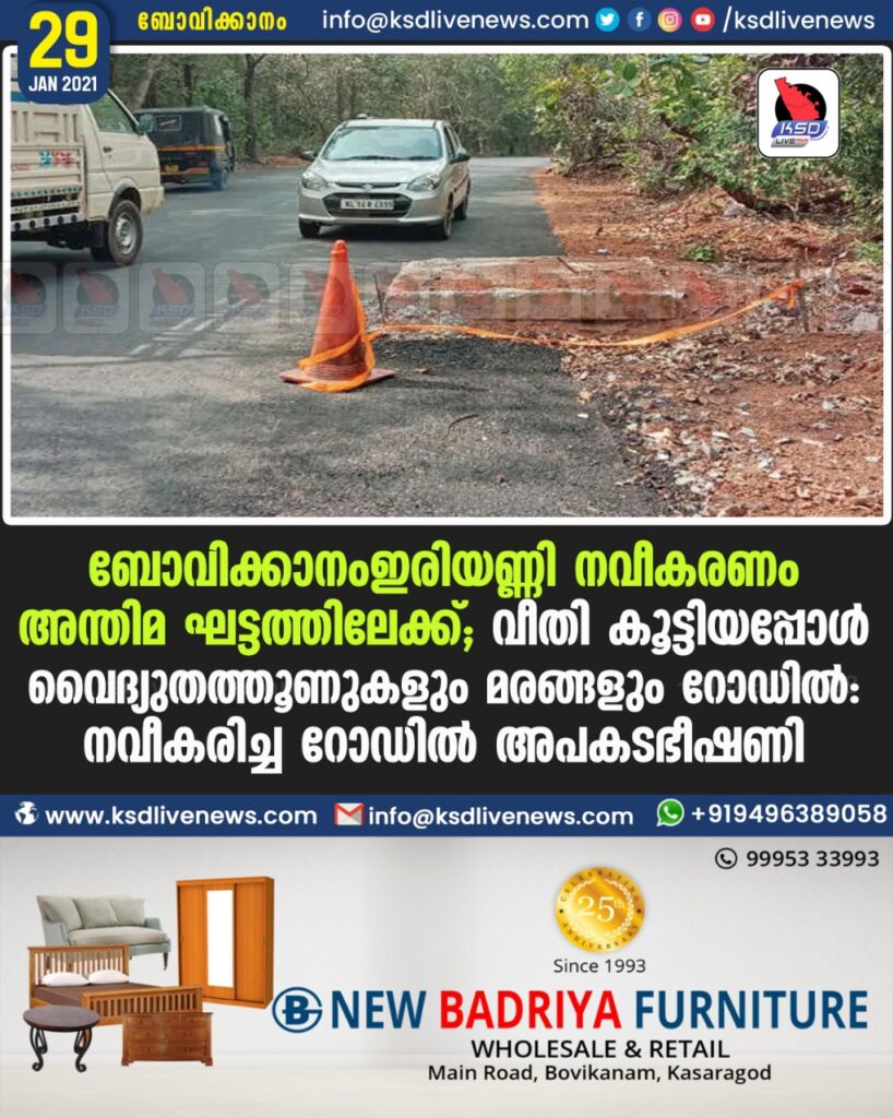 ബോവിക്കാനം: നവീകരണ പ്രവൃത്തി അന്തിമഘട്ടത്തിലേക്ക് നീങ്ങുമ്പോഴും ബോവിക്കാനം-ഇരിയണ്ണി റോഡിൽ വൈദ്യുതത്തൂണുകളും മരങ്ങളും മാറ്റുന്നതിനുള്ള നടപടി നീളുന്നത് ആശങ്കയുയർത്തുന്നു. റോഡ് നവീകരിച്ചതോടെ ഇതു വഴിയുള്ള വാഹനങ്ങൾക്കും വേഗം കൂടിയിട്ടുണ്ട്.