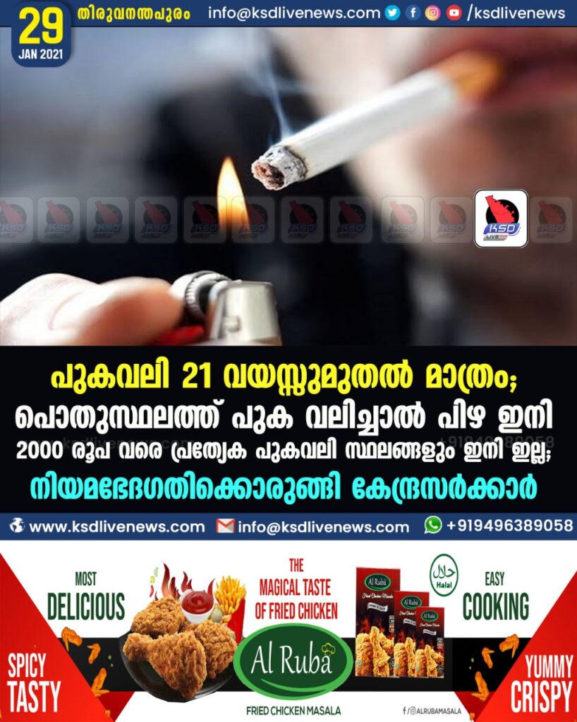 പുകവലി 21 വയസ്സുമുതൽ മാത്രം ; പൊതുസ്ഥലത്ത് പുക വലിച്ചാൽ പിഴ ഇനി 2000 രൂപ വരെ പ്രത്യേക പുകവലി സ്ഥലങ്ങളും ഇനി ഇല്ല ; നിയമഭേദഗതിക്കൊരുങ്ങി കേന്ദ്രസർക്കാർ
