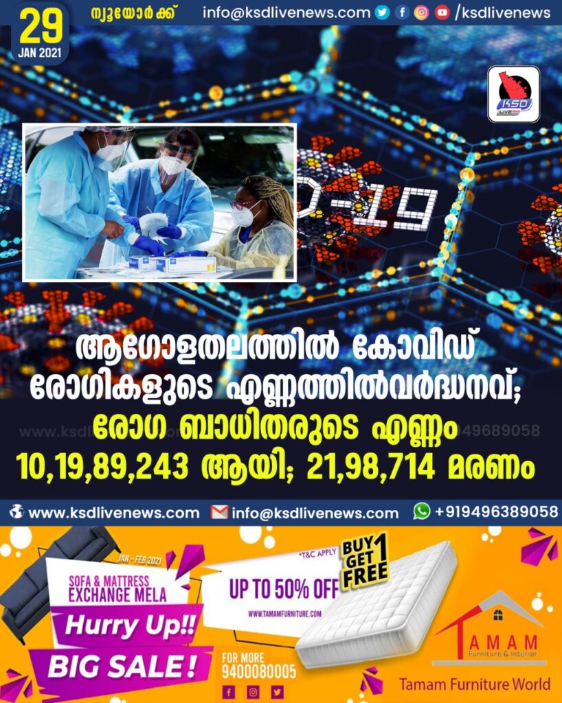 ആഗോളതലത്തിൽ കോവിഡ് രോഗികളുടെ എണ്ണത്തിൽ വർദ്ധനവ് ; രോഗ ബാധിതരുടെ എണ്ണം 10,19,89,243 ആയി; 21,98,714 മരണം