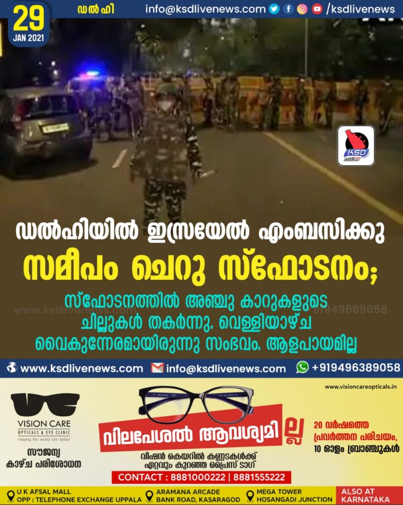 ഡല്‍ഹിയില്‍ ഇസ്രയേല്‍ എംബസിക്കു സമീപം ചെറു സ്‌ഫോടനം; സ്ഫോടനത്തിൽ അഞ്ചു കാറുകളുടെ ചില്ലുകൾ തകർന്നു. വെള്ളിയാഴ്ച വൈകുന്നേരമായിരുന്നു സംഭവം. ആളപായമില്ല