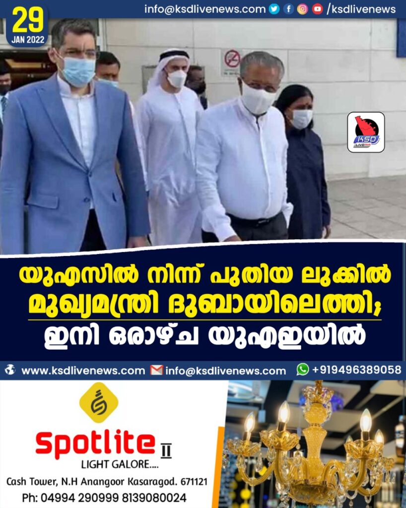 ദുബായ് ∙ യുഎസിലെ ചികിത്സയ്ക്കു ശേഷം മുഖ്യമന്ത്രി പിണറായി വിജയൻ ഇന്നു രാവിലെ ദുബായിലെത്തി. ഒരാഴ്ച യുഎഇയിൽ വിവിധ പരിപാടികളിൽ പങ്കെടുക്കും.