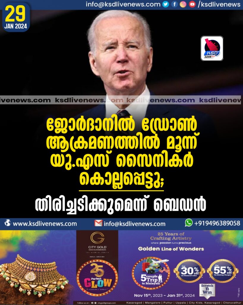 ജോർദാനിൽ ഡ്രോൺ ആക്രമണത്തിൽ മൂന്ന് യു.എസ് സൈനികർ കൊല്ലപ്പെട്ടു; തിരിച്ചടിക്കുമെന്ന് ബെഡൻ