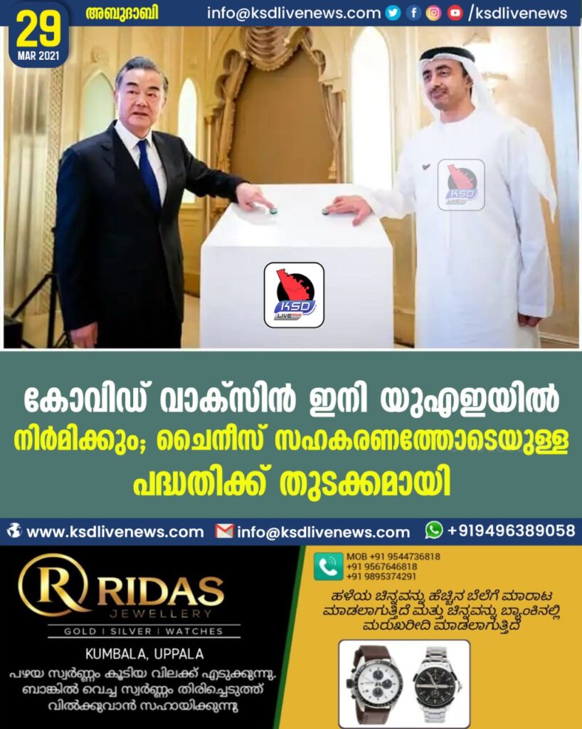 കോവിഡ് വാക്സിന് ഇനി യുഎഇയില് നിര്മിക്കും; ചൈനീസ് സഹകരണത്തോടെയുള്ള പദ്ധതിക്ക് തുടക്കമായി