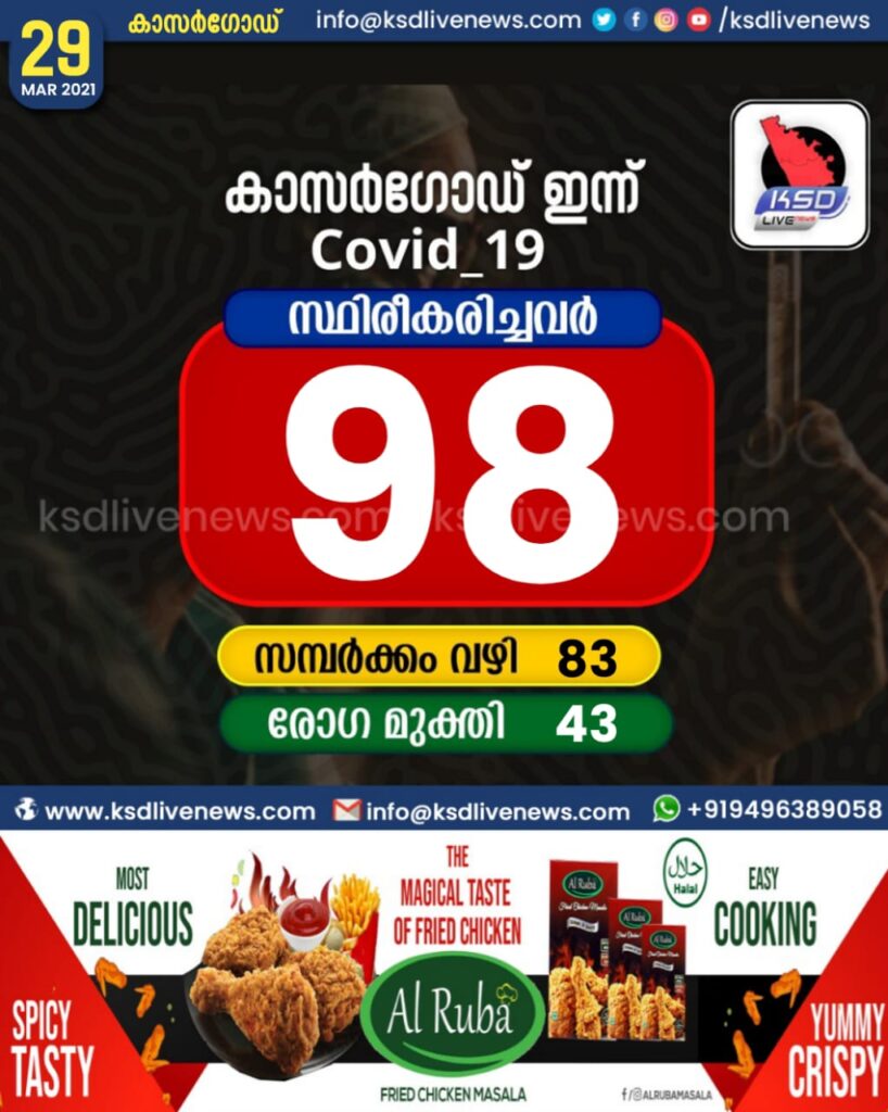 കാസർഗോഡ് ജില്ലയിൽ ഇന്ന് 98 പേർക്ക് കോവിഡ് സ്ഥിരീകരിച്ചു. സമ്പർക്കം വഴി 83 പേർക്കും. 43 പേർക്ക് രോഗമുക്തിSHARE THIS ONകാസർഗോഡ് ജില്ലയിൽ ഇന്ന് 98 പേർക്ക് കോവിഡ് സ്ഥിരീകരിച്ചു. സമ്പർക്കം വഴി 83 പേർക്കും. 43 പേർക്ക് രോഗമുക്തി