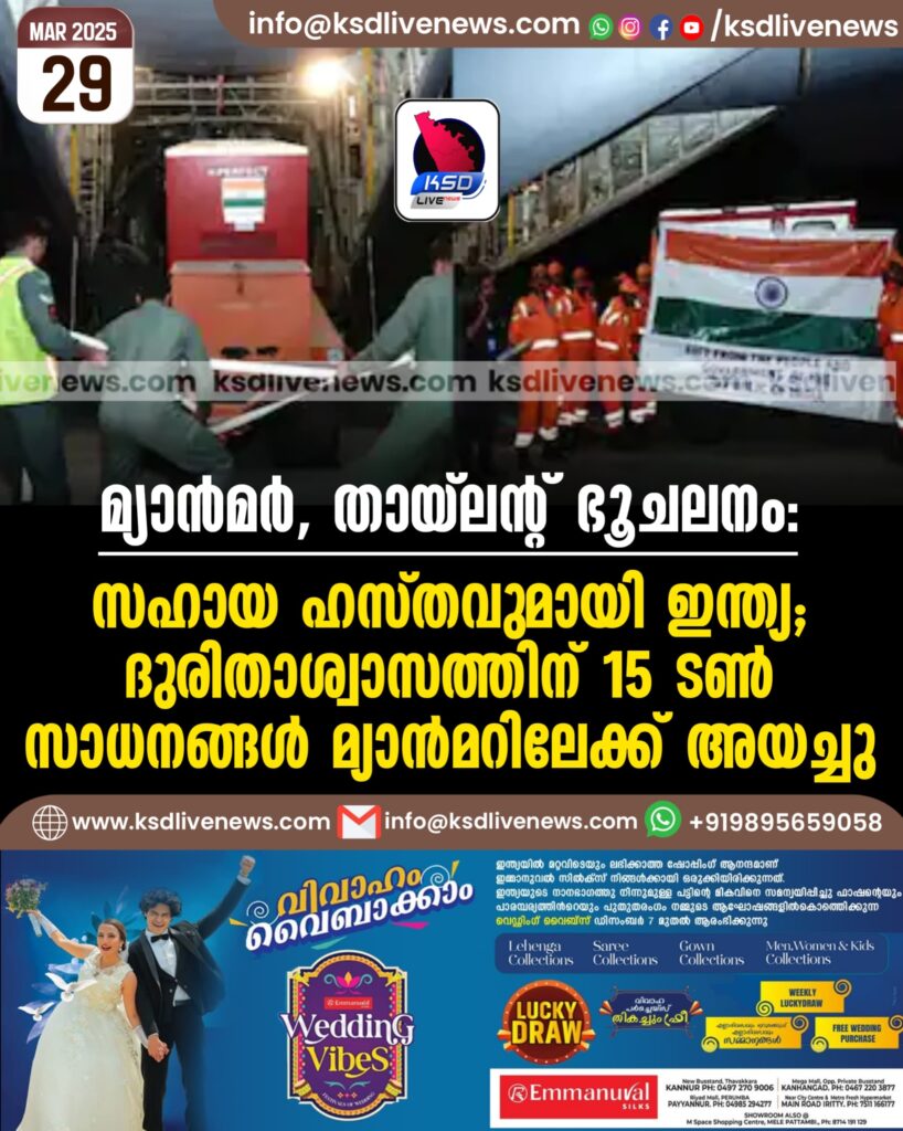 മ്യാൻമർ, തായ്‍ലന്റ് ഭൂചലനം: സഹായ ഹസ്തവുമായി ഇന്ത്യ; ദുരിതാശ്വാസത്തിന് 15 ടൺ സാധനങ്ങൾ മ്യാൻമറിലേക്ക് അയച്ചു