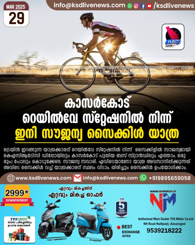 കാസർകോട് റെയിൽവേ സ്റ്റേഷനിൽ നിന്ന് ഇനി സൗജന്യ സൈക്കിൾ യാത്ര