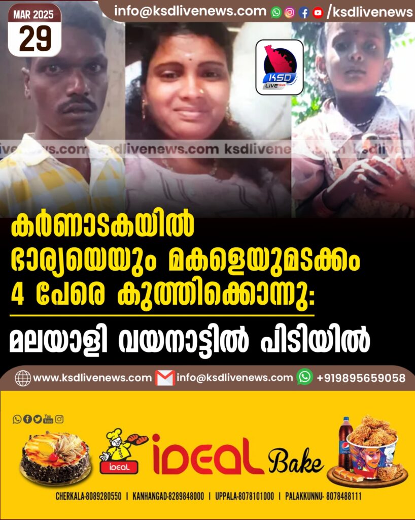 കർണാടകയിൽ ഭാര്യയെയും മകളെയുമടക്കം 4 പേരെ കുത്തിക്കൊന്നു; മലയാളി വയനാട്ടിൽ പിടിയിൽ