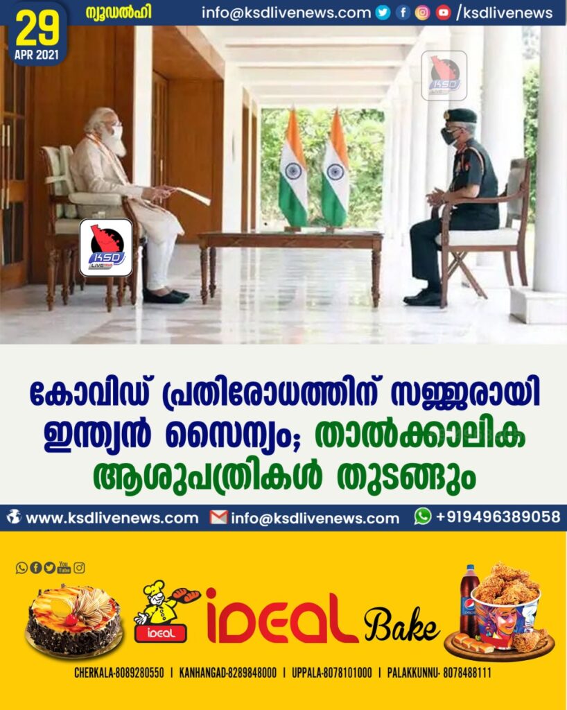 ന്യൂഡല്ഹി: രാജ്യത്ത് കോവിഡ് വ്യാപനം ശക്തമായിരിക്കുന്ന സാഹചര്യത്തില് സംസ്ഥാനങ്ങള്ക്ക് സഹായവുമായി സൈന്യം. ഇതുമായി ബന്ധപ്പെട്ട് പ്രധാനമന്ത്രിയുമായി കരസേനാ മേധാവി കൂടിക്കാഴ്ച നടത്തി.