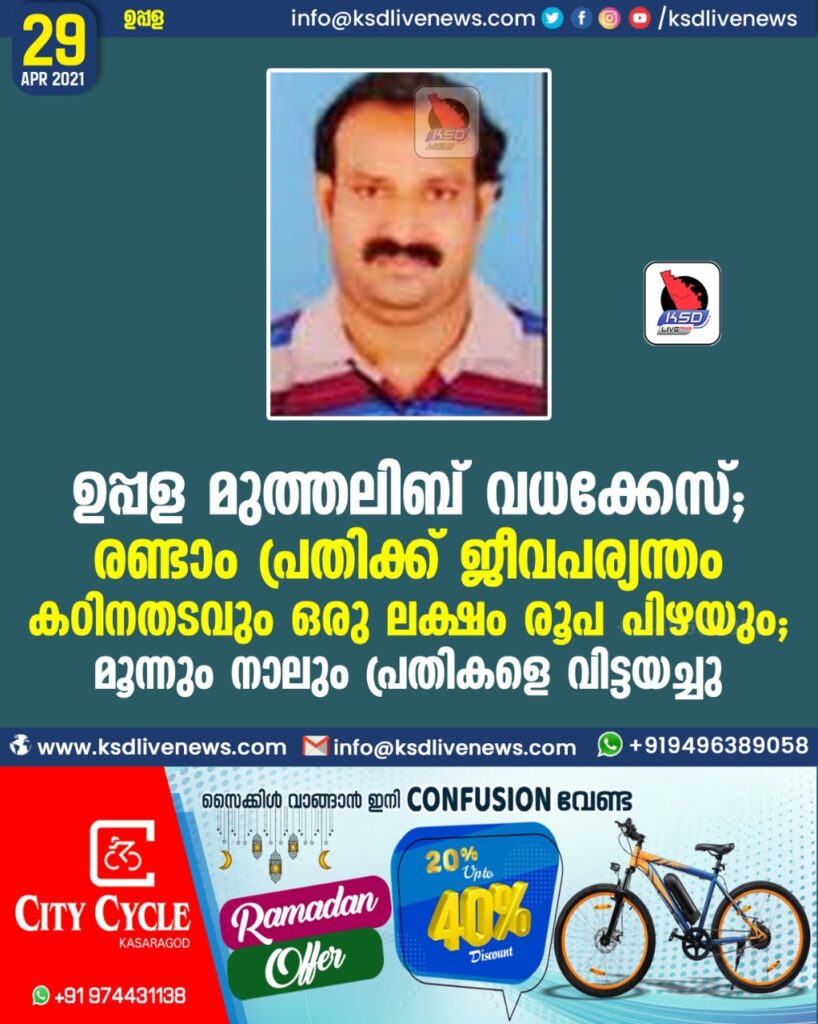 ഉപ്പള മുത്തലിബ് വധക്കേസ്; രണ്ടാം പ്രതിക്ക് ജീവപര്യന്തം കഠിനതടവും ഒരു ലക്ഷം രൂപ പിഴയും; മൂന്നും നാലും പ്രതികളെ വിട്ടയച്ചു