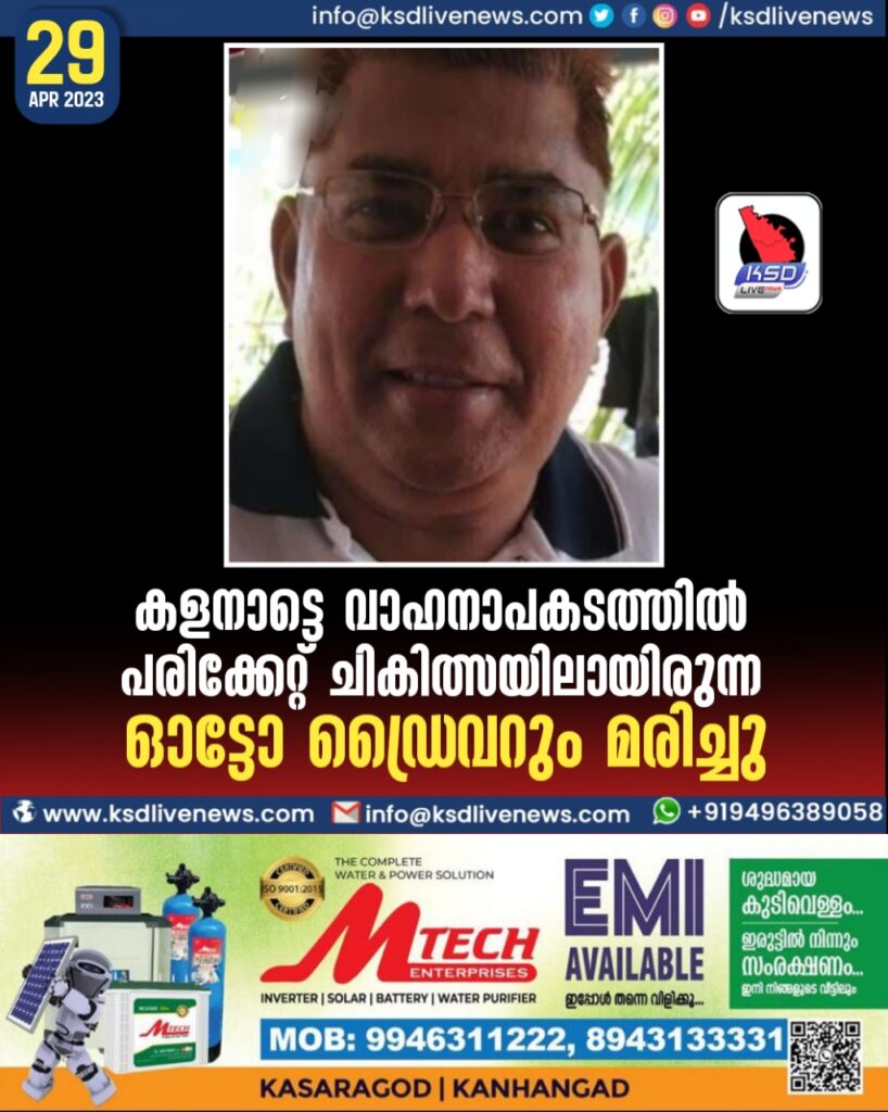 കളനാട്ടെ വാഹനാപകടത്തിൽ പരിക്കേറ്റ് ചികിത്സയിലായിരുന്ന ഓട്ടോ ഡ്രൈവറും മരിച്ചു