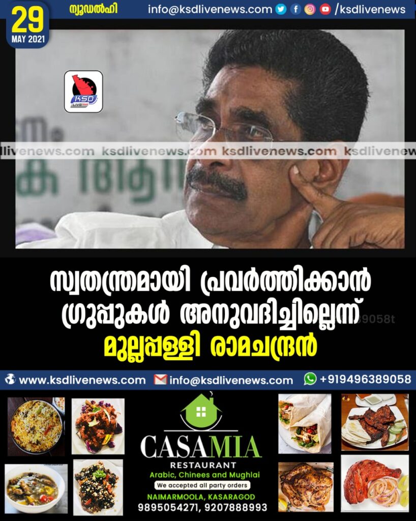 സ്വതന്ത്രമായി പ്രവര്ത്തിക്കാന് ഗ്രുപ്പുകള് അനുവദിച്ചില്ലെന്ന് മുല്ലപ്പള്ളി രാമചന്ദ്രന്