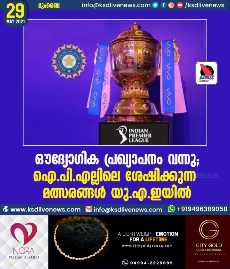 ഔദ്യോഗിക പ്രഖ്യാപനം വന്നു; ഐ.പി.എല്ലിലെ ശേഷിക്കുന്ന മത്സരങ്ങള് യു.എ.ഇയില്