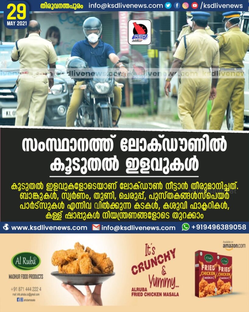 സ്വര്‍ണം, തുണി, ചെരുപ്പ്, പുസ്തകങ്ങള്‍ സ്പെയര്‍പാര്‍ട്സുകള്‍ എന്നിവ വില്‍ക്കുന്ന കടകള്‍, കശുവണ്ടി ഫാക്ടറികൾ, കള്ള് ഷാപ്പുകൾ നിയന്ത്രണങ്ങളോടെ തുറക്കാം. ഇളവുകള്‍ സംബന്ധിച്ചുള്ള കൂടുതൽ വിശദാംശങ്ങൾ മുഖ്യമന്ത്രി വൈകുന്നേരം വാർത്താ സമ്മേളനത്തിൽ അറിയിക്കും