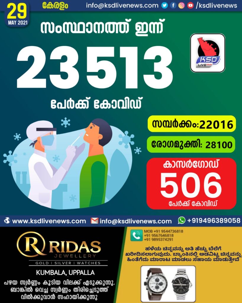 സംസ്ഥാനത്ത് ഇന്ന് 23513 പേർക്ക് കോവിഡ് സ്ഥിരീകരിച്ചു. സമ്പർക്കം വഴി 22016 പേർക്കും ; ആശ്വാസമായി 28100 പേർക്ക് രോഗ മുക്തിയും ; കാസർഗോഡ് ജില്ലയിൽ 506 പേർക്ക് പുതിയ കോവിഡ് കേസുകൾ ; മരണം 198