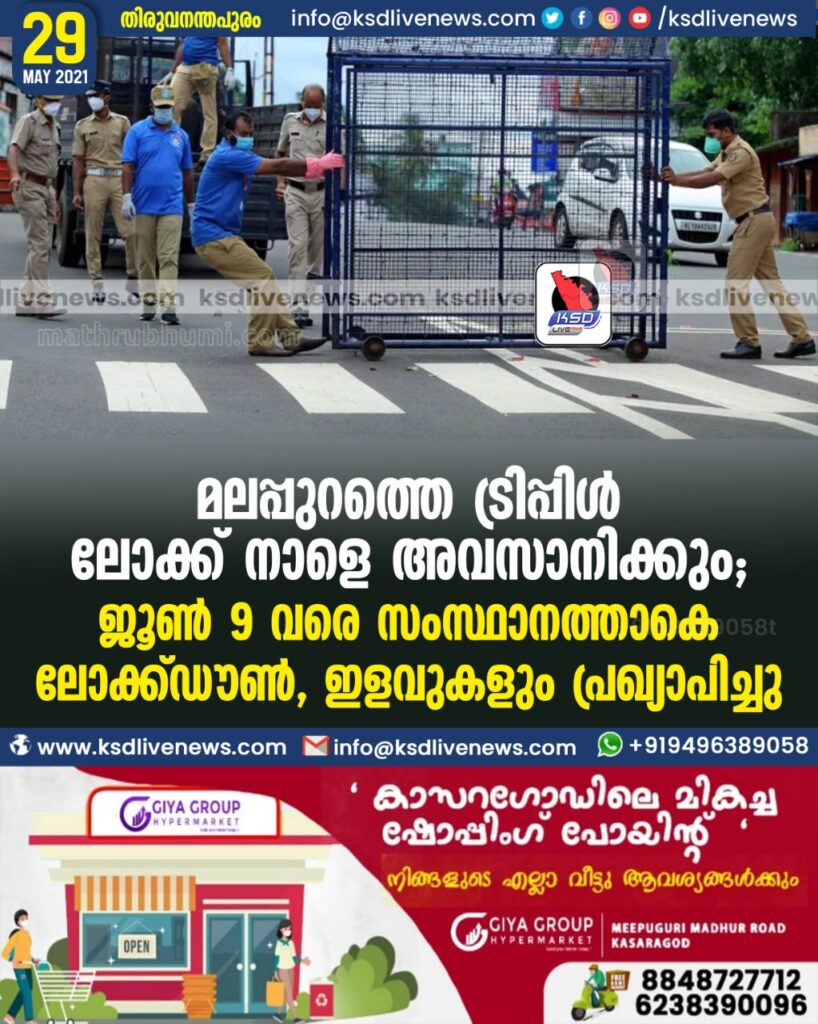 മലപ്പുറത്തെ ട്രിപ്പിൾ ലോക്ക് നാളെ അവസാനിക്കും; ജൂൺ 9 വരെ സംസ്ഥാനത്താകെ ലോക്ക്ഡൗൺ, ഇളവുകളും പ്രഖ്യാപിച്ചു