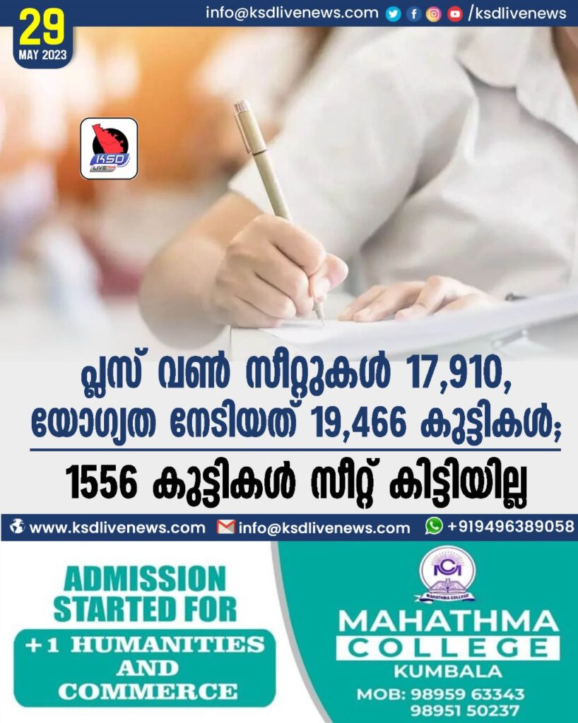 പ്ലസ് വണ് സീറ്റുകള് 17,910, യോഗ്യത നേടിയത് 19,466 കുട്ടികള്; 1556 കുട്ടികള് സീറ്റ് കിട്ടിയില്ല