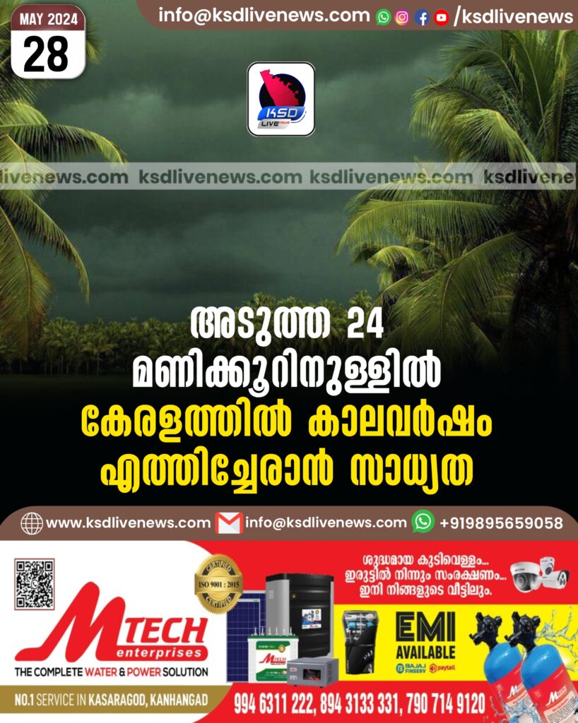 അടുത്ത 24 മണിക്കൂറിനുള്ളില് കേരളത്തില് കാലവര്ഷം എത്തിച്ചേരാന് സാധ്യത