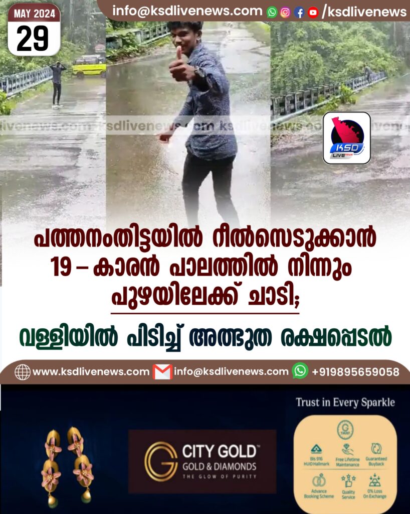 പത്തനംതിട്ടയിൽ റീൽസെടുക്കാൻ 19-കാരൻ പാലത്തിൽ നിന്നും പുഴയിലേക്ക് ചാടി; വള്ളിയിൽ പിടിച്ച് അത്ഭുത രക്ഷപ്പെടൽ