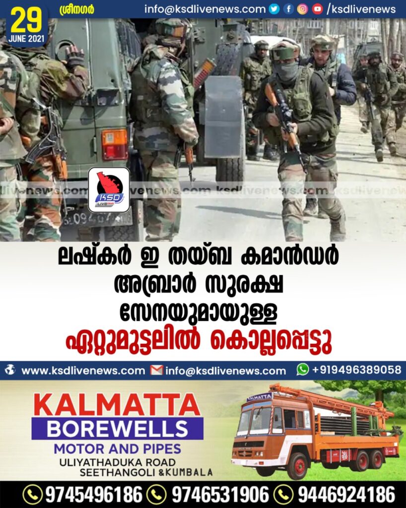 ലഷ്കർ ഇ തയ്ബ കമാൻഡർ അബ്രാർ സുരക്ഷ സേനയുമായുള്ള ഏറ്റുമുട്ടലിൽ കൊല്ലപ്പെട്ടു