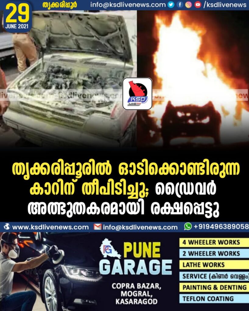 തൃക്കരിപ്പൂരിൽ ഓടിക്കൊണ്ടിരുന്ന കാറിന് തീപിടിച്ചു; ഡ്രൈവർ അത്ഭുതകരമായി രക്ഷപ്പെട്ടു