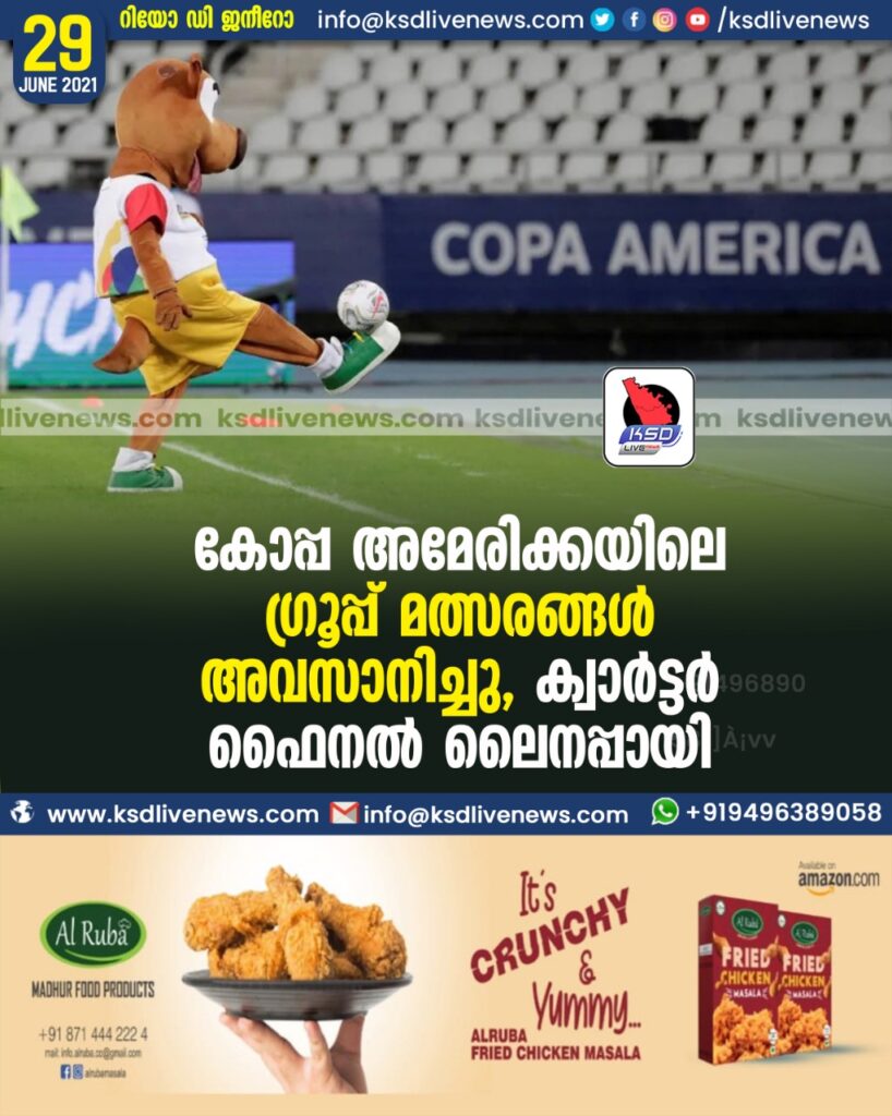 റിയോ ഡി ജനീറോ: കോപ്പ അമേരിക്കയിലെ ഗ്രൂപ്പ് മത്സരങ്ങൾ അവസാനിച്ചു. ഗ്രൂപ്പ് എ യിൽ അർജന്റീനയും ഗ്രൂപ്പ് ബി യിൽ ബ്രസീലും ഒന്നാം സ്ഥാനത്തെത്തി. അഞ്ചുടീമുകൾ അണിനിരന്ന രണ്ട് ഗ്രൂപ്പിൽ നിന്നും നാല് ടീമുകൾ വീതം ക്വാർട്ടർ ഫൈനലിൽ പ്രവേശിച്ചു. ക്വാർട്ടർ ഫൈനൽ മത്സരങ്ങൾ ജൂലായ് മൂന്നിന് ആരംഭിക്കുംCOPA AMERICA 2021