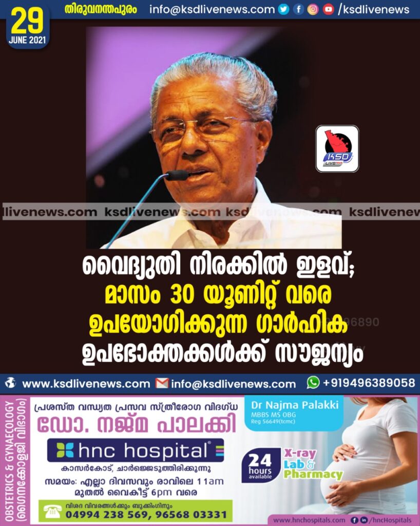 വൈദ്യുതി നിരക്കില്‍ ഇളവ്; മാസം 30 യൂണിറ്റ് വരെ ഉപയോഗിക്കുന്ന ഗാര്‍ഹിക ഉപഭോക്തക്കള്‍ക്ക് സൗജന്യം