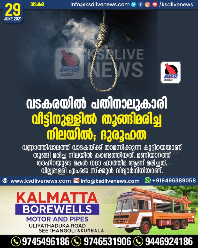 വടകരയില് പതിനാലുകാരി വീട്ടിനുള്ളില് തൂങ്ങിമരിച്ച നിലയില്; ദുരൂഹത